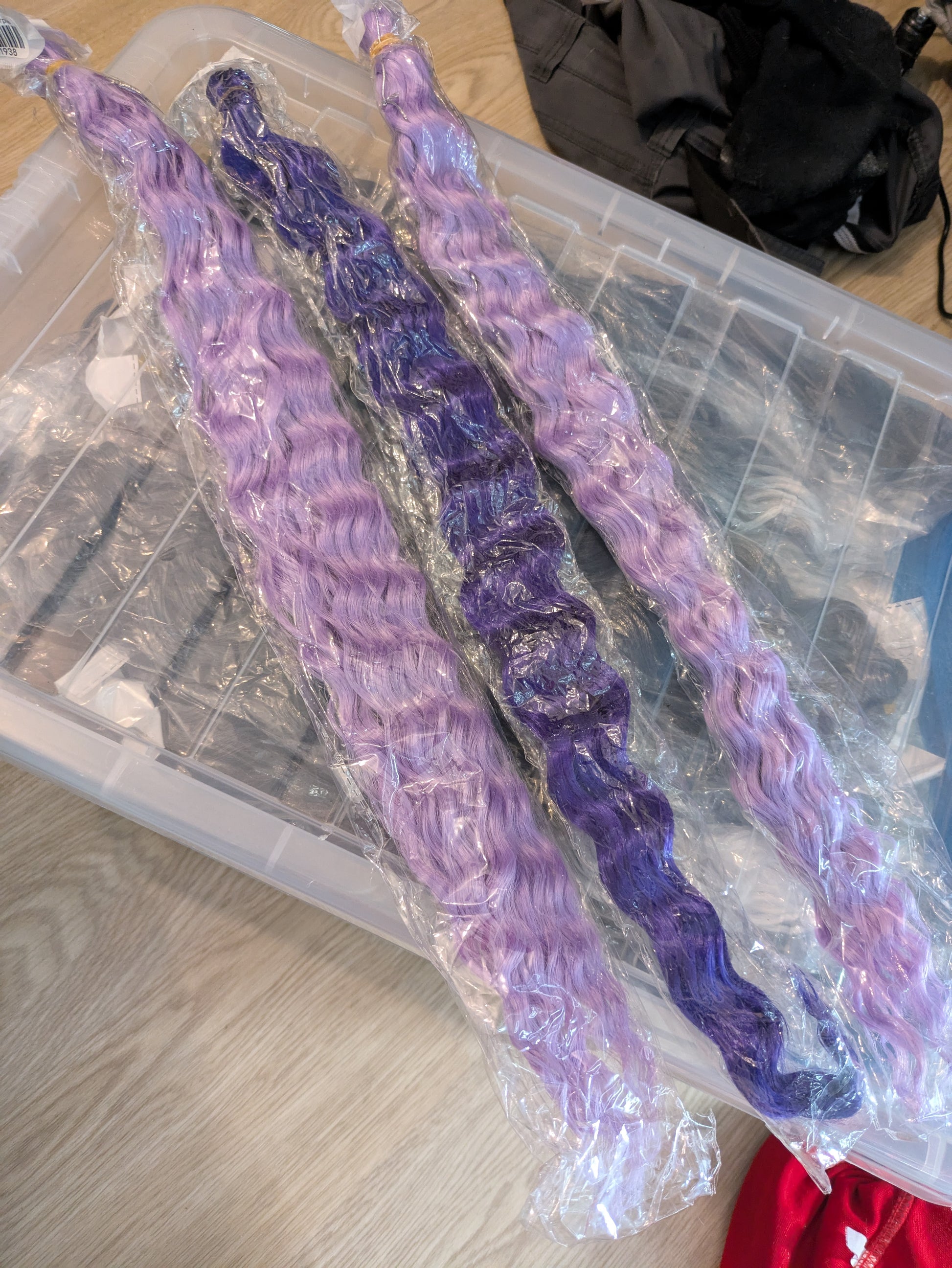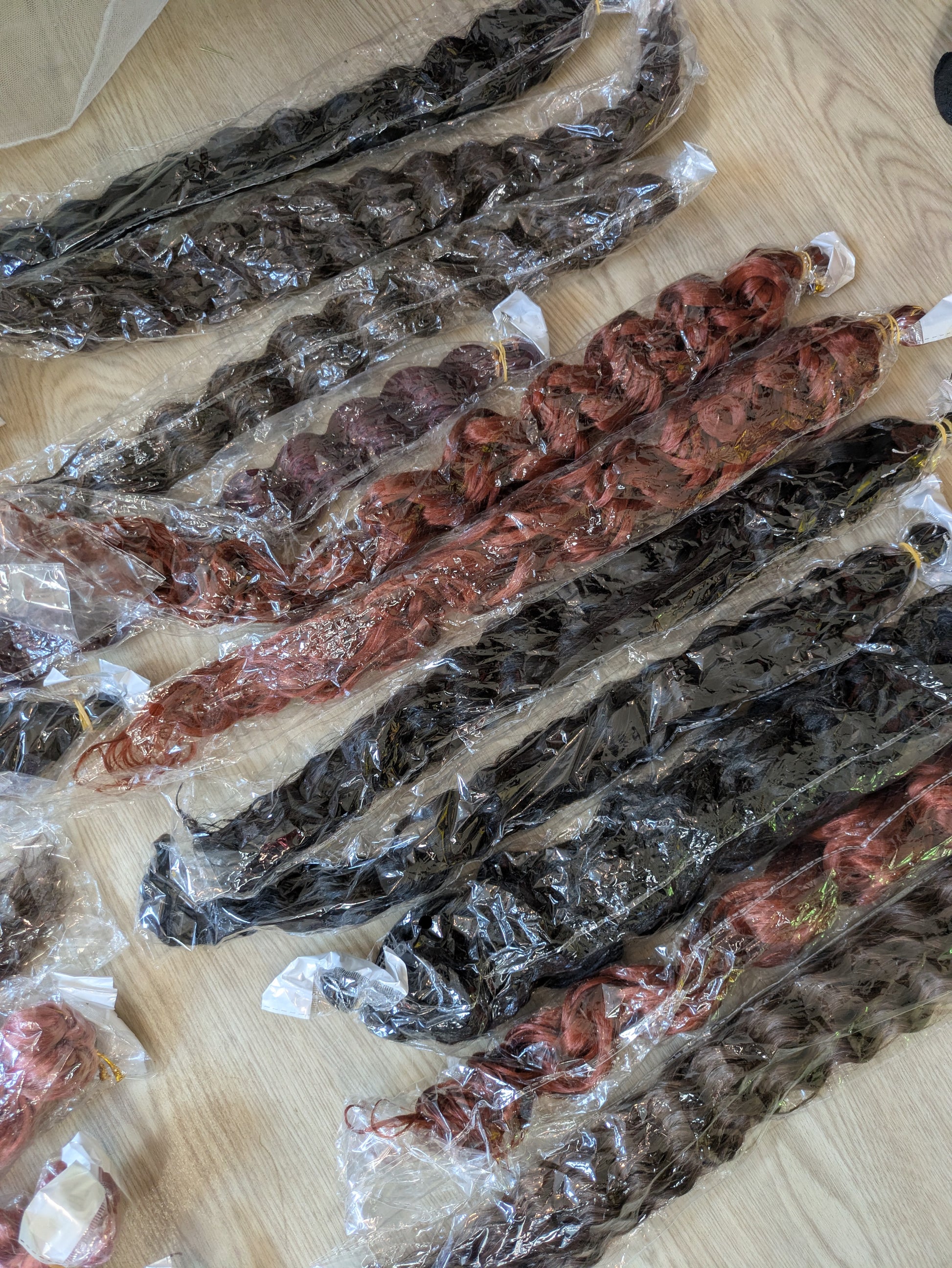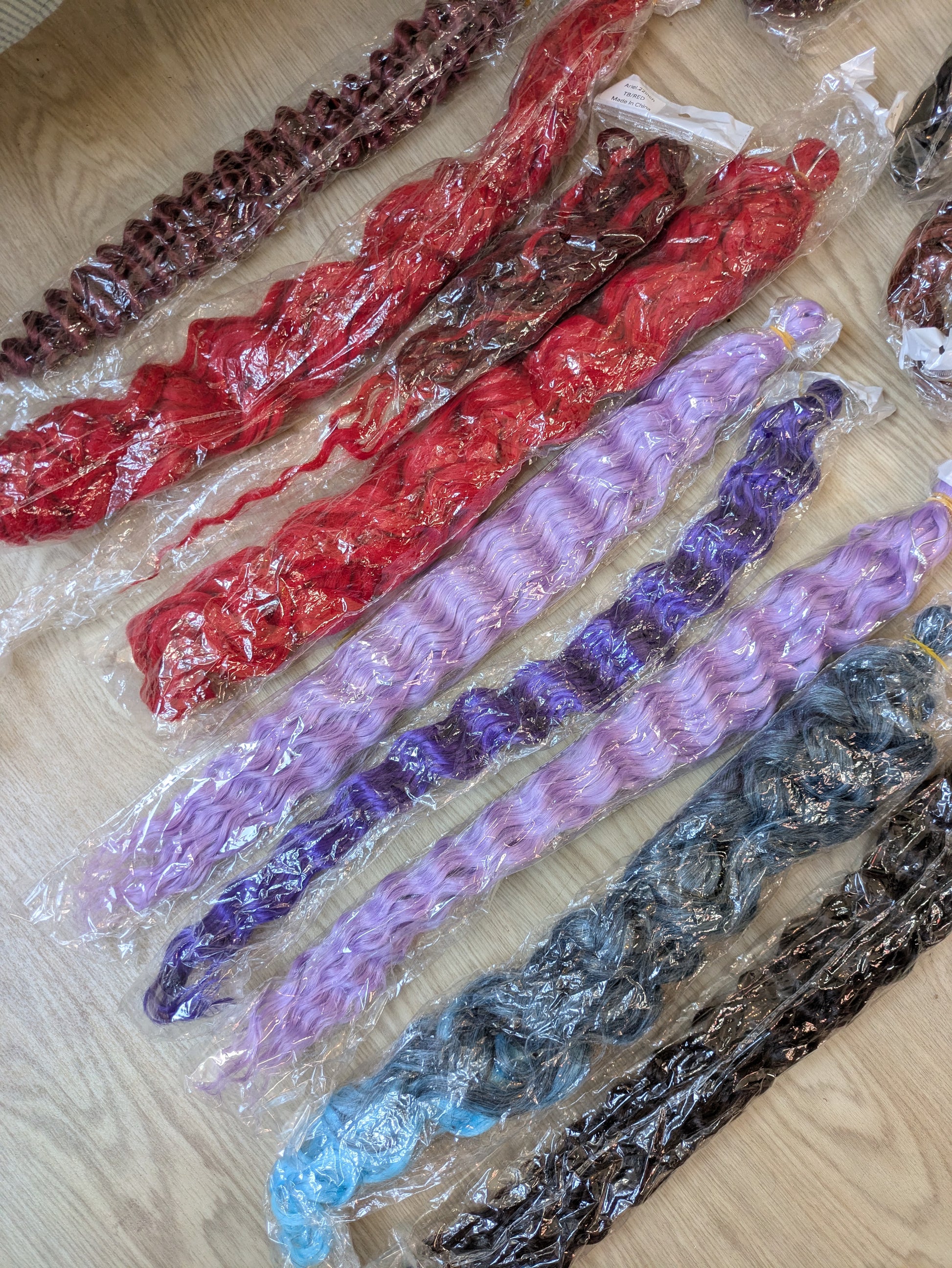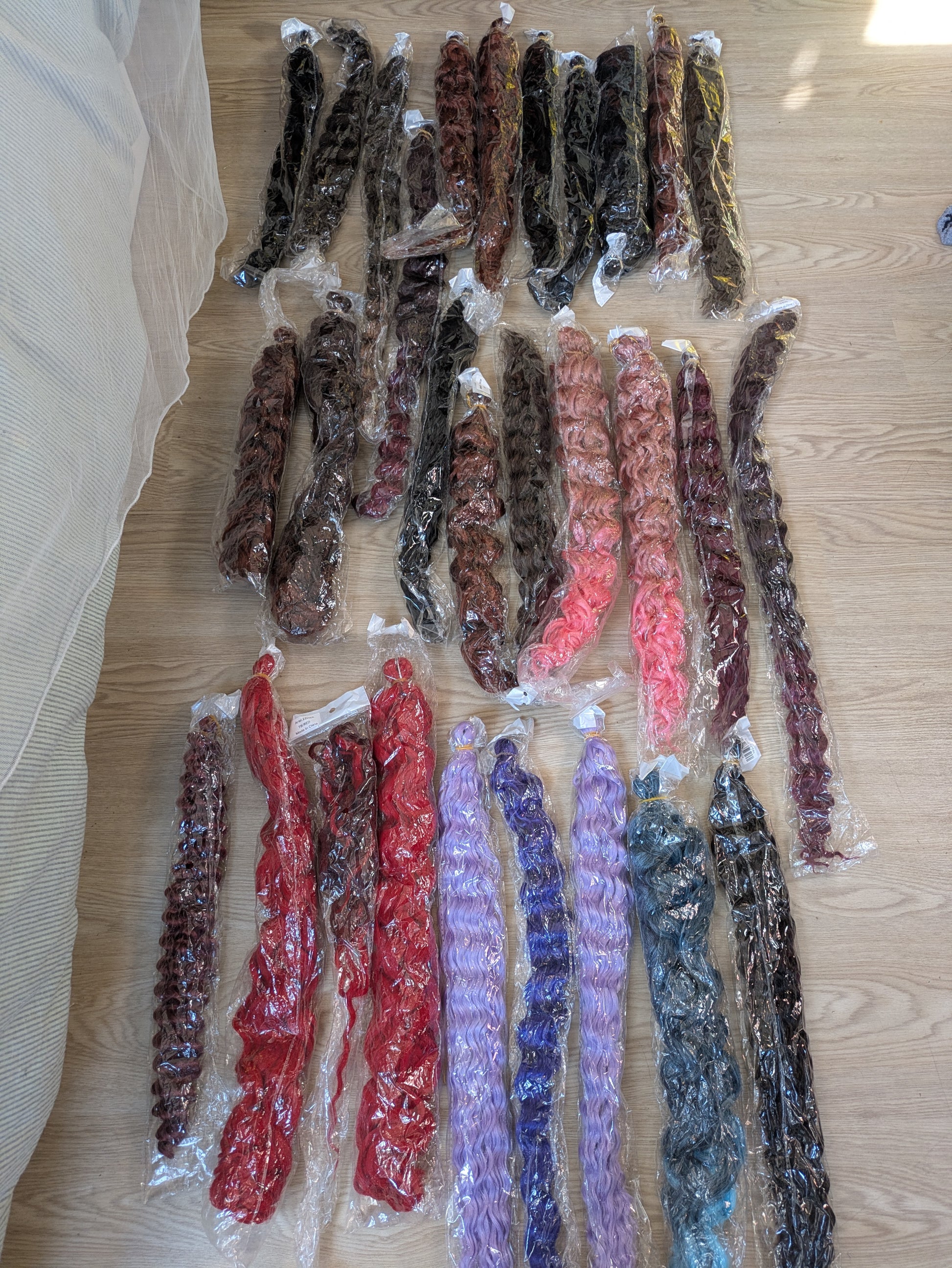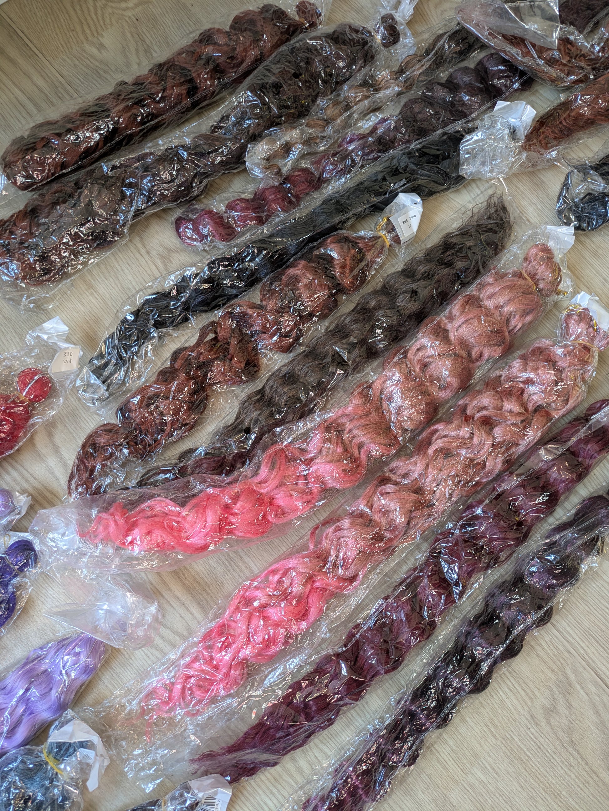 28 full packs plus a partial pack, of factory curled hair for making Hybrid locks. Mixed colours, curl patterns and lengths (non Brushable)